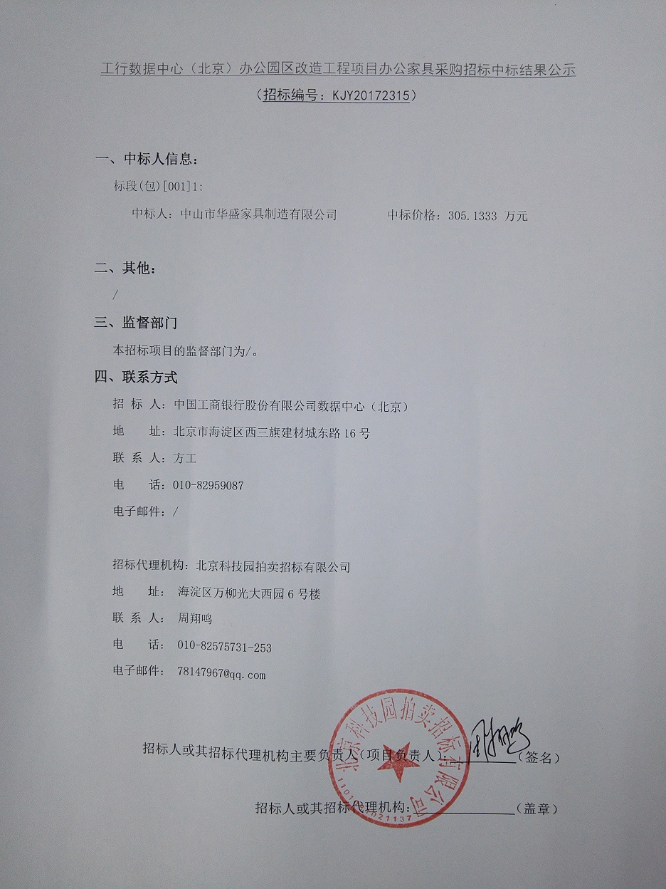 工行數據中心(北京)辦公園區改造工程項目辦公家具采購招標中標結果公示