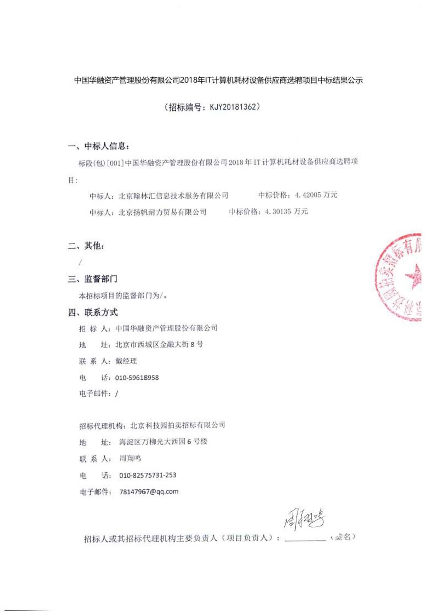 中國華融資產(chǎn)管理股份有限公司2018年IT計(jì)算機(jī)耗材設(shè)備供應(yīng)商選聘項(xiàng)目中標(biāo)結(jié)果公示